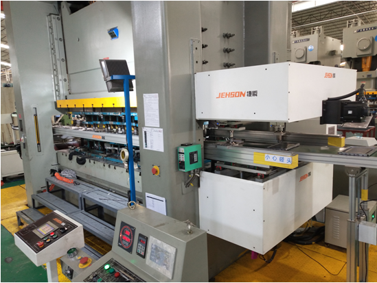 項目概要:模本項目憑借我司集沖壓模具、機器人、系統集成"交鑰匙"服務優勢,提供一套適合電飯煲從原材料片料經伺服片料機實現自動抹油、拉伸上料,再經擺臂機器人柔性連線多道沖壓成形設備,最后經碼垛機器人完成堆碼,全自動化、無人化智能機器人生產線。